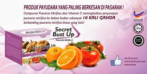 Secret Bust Up Pueraria Mirifica ialah produk untuk membesarkan payudara yang kecil dan menegangkan payudara yang kendur. Kandungan pueraria mirifica yang terdapat dalam produk ini sangat tinggi iaitu 8000mg extra 22,000mg sekotak. Ini memberikan kelebihan kepada produk ini berbanding produk lain !